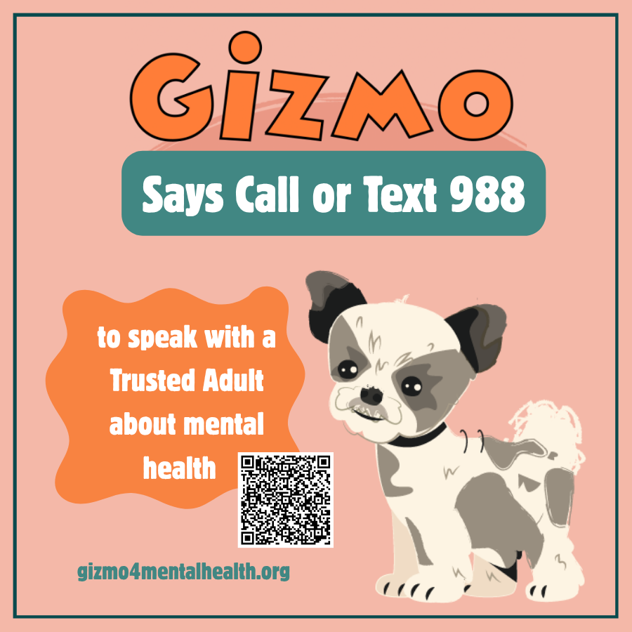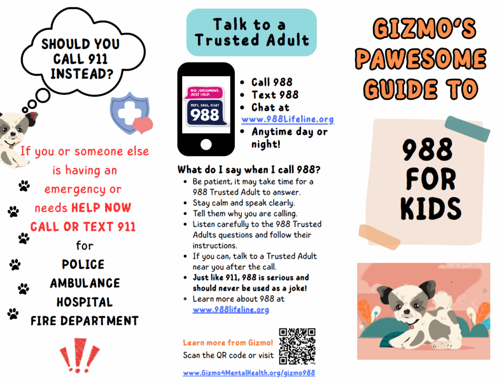Check out Gizmo’s Pawesome Guide to 988 materials that take a friendly approach to teach children about reaching a Trusted Adult through 988; including an animated video, social media posts and an orderable brochure and sticker. https://www.gizmo4mentalhealth.org/gizmo988/ #Gizmo4MentalHealth #Gizmo988