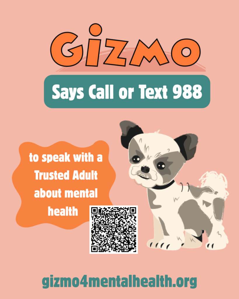 Hi, I’m Gizmo! I’m a therapy dog here to tell you that 988 is a phone line you can call or text to talk about your feelings, thoughts, and actions with a Trusted Adult. Learn more from Gizmo and about 988 on www.gizmo4mentalhealth.org/gizmo988.